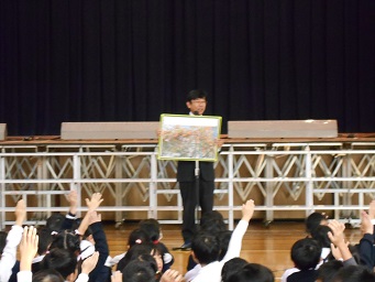 11月5日(月)今日の児童朝会では、まず講堂の舞台を背に、18日(日)に行われる学習発表会に向けて、自分の役割に応じてセリフや演技を丁寧に心を込めてするように話しました。