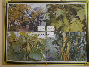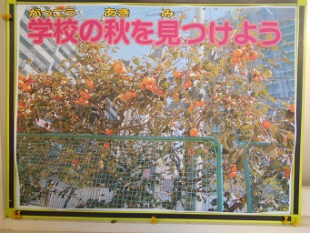 最後に、校庭にある柿の木の写真を見せ、たくさんの実がなっていることから、実りの秋のお話をしました。「学校の秋を見つけよう」というテーマで校内を歩くと、いろいろな秋が見つかりました。梅の葉が色づいています。ヘチマやヒョウタン、トウモロコシも大きな実がなっています。写真を見せ、子ども達も秋を探してほしいとお願いしました。