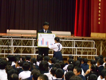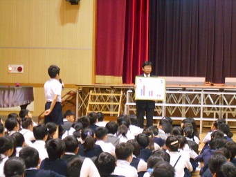 最後に、1学期に取ったいじめアンケートの結果のグラフをもとに、「いやなことしない させない」学校になるための話合いをしました。