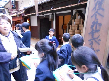 江戸時代を再現した街並みを見たり、ワークシートをもとに質問の答えを探したりしました。