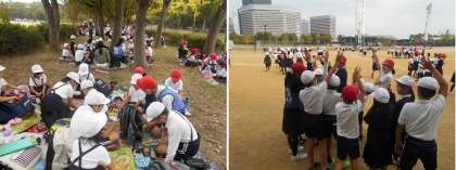 全校で行った大阪城公園への遠足。スマイル班でお弁当を食べたり、仲よく遊んだりして班の子との交流を深めました。