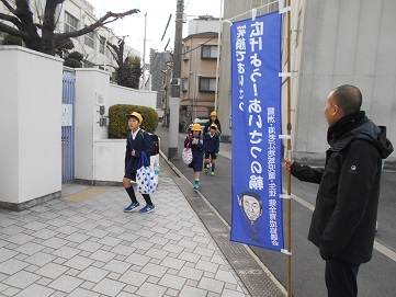 今日も早朝より、寒空のもと、保護者の方に参加していただきました。子どもたちに「おはよう!」と声をかけていただき、子どもたちは、寒さに負けない元気な声で「おはようございます。」と返していました。