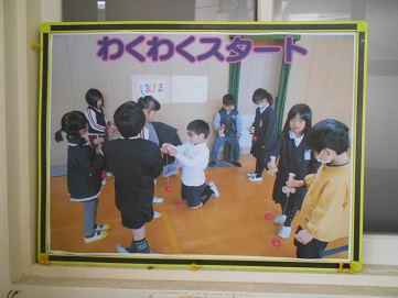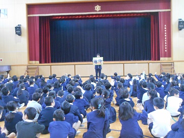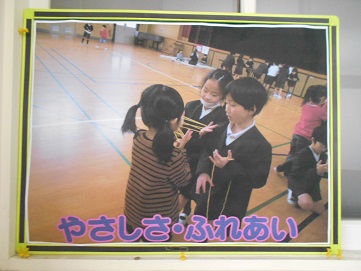 続いて、先週末の「わくわくスタート」の写真を見せ、1年生が幼児にしてくれた昔あそびの様子を紹介しました。ふれあいを通して、やさしさや思いやりがいっぱいの活動がうかがえ、素晴らしさを称えました。こうした気持ちをどの学年ももって人に接してほしいと付け加えました。