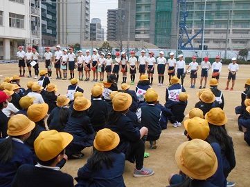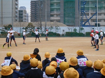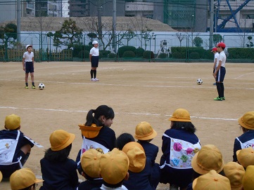 その後、キャッチボールの仕方やサッカーのボールの蹴り方を実演しました。また、キックベースボールのミニゲームを見せました。見ている子ども達も高学年の子の実技に驚いていました。