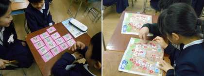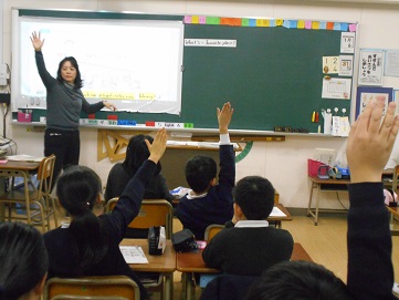 映像を視聴し、聞き取れた教室名を発表したり、ペアで校内地図を見て聞こえた教室を探して指さしたりしました。先生がほとんど英語だけで授業を進めました。子ども達は一生懸命質問を聞き取り、ゲームを楽しんだり、英語で答えたりしました。