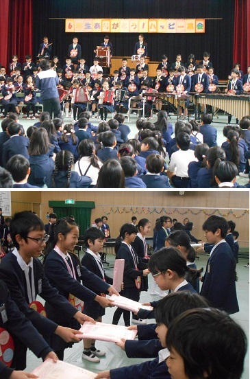 3月7日(木)児童会主催の卒業を祝う会「6年生ありがとう!ハッピー集会」がありました。はじめの言葉の後、「卒業生と遊ぼう」でしりとりゲームを楽しみました。その後、みんなで「手紙〜拝啓十五の君へ〜(替え歌)」を歌いました。それから先日作ったスマイル班の寄せ書きプレゼントを在校生が6年生の首にかけました。6年生からお返しに合奏とぞうきんの贈り物がありました。
