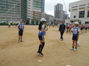 体つくり運動「巧みな動きを高めるために」「持続する能力を高めるために」という単元で、長縄を使って「フラフープジャンプ」「連続ボールパス」「8の字パス」などグループで教え合い、挑戦していました。