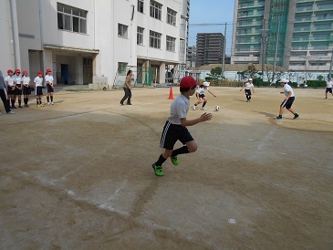 攻撃側のチームの児童はボールを蹴って、1塁・2塁・3塁に置かれたコーンを左回りで走ります、守備側のチームの児童は蹴られたボールを取って、運動場に描かれた3つの円の中にいる児童に素早く渡します。その間に攻撃側の児童が走った塁までが得点となります。攻撃側の児童が全員蹴り終わったら攻守交代します。