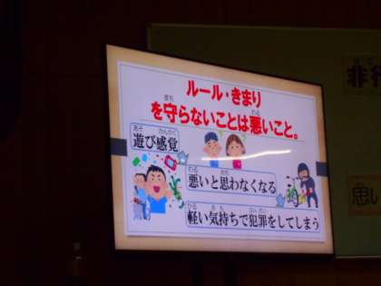 大切なことは、「ルールを守ること」であること、もしこんな事したら、おうちの人やお店の人が悲しんだり困ったりするだろうな、という心「思いやり」の心をもってほしいこと、そして最後に、これから中学生、高校生になる中で、いろいろな悪い誘惑もある。そんな時は断る勇気を持ってほしい、というお話でした。