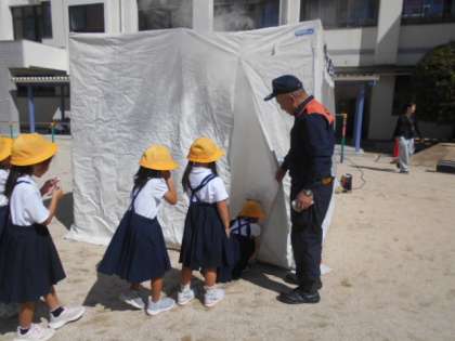 煙でいっぱいのテントの中に一人ずつ入りました。「できるだけ姿勢を低くして歩きましょう。」と教えてもらいました。子どもたちは、「真っ白で何にも見えない!」と言いながら体験していました。