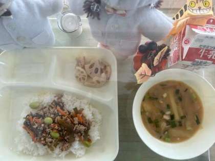 給食のジューシーは、豚ひき肉、にんじん、むきえだまめ、もずく、切りこんぶなどを使った、たきこみご飯風です。ご飯と具を混ぜて食べましょう。