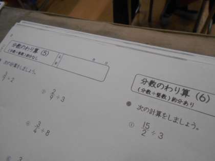 「分数のわり算」や「組み合わせ図形の面積」など、前学年までの単元の復習プリントを自分のペースで解いていきます。できたら、裏にあるこたえを見て、自分で答え合わせをしました。わからないところは、先生に教えてもらいながらがんばっていました。