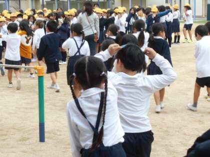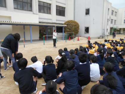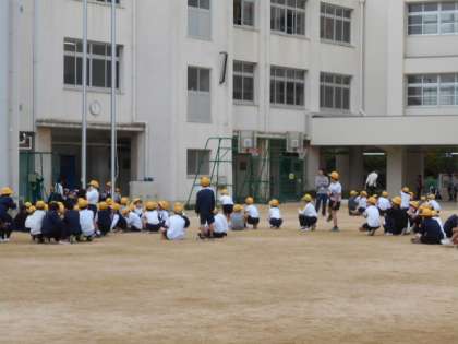 「ハンカチで鼻と口を押えて」「廊下や階段は走らないで」運動場に避難する、という放送が流れると、運動場にいた子どもたちは鉄棒のあるほうに集まり、教室にいた子どもたちは、静かに並んで降りてきました。