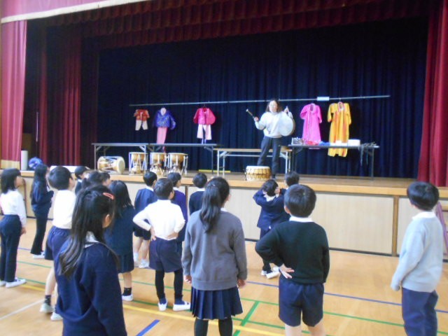 児童朝会で、校長先生から、「韓国は日本にとって、海を隔てて最も近い国」というお話がありました。ゲストティーチャーとしてきていただいたソンセンニムからは、「大阪から韓国まで飛行機だと1時間半くらい。そのくらい近い国です。みなさんも、いろいろな文化に親しんでください。」とお話していただきました。