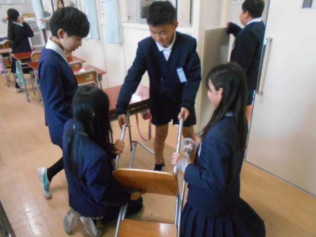 5年生も、2学期、自分たちが使った机の中や椅子の足なども、班で協力しながら、雑巾で拭き掃除をしていました。