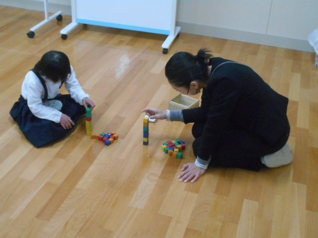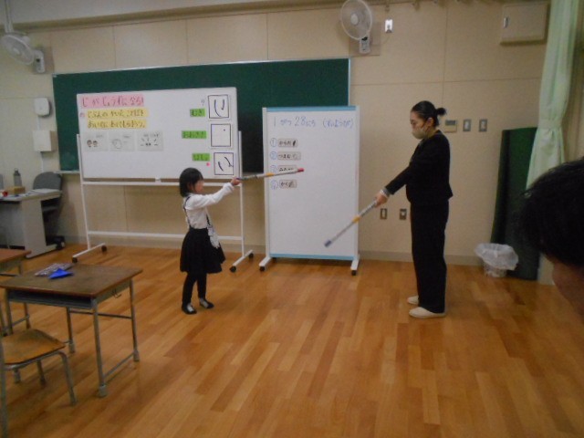1年生の児童は、担当の教員と会話をしながら、気持ちをそらすことなく一つ一つの活動に取り組んでいました。