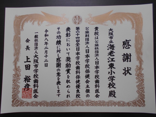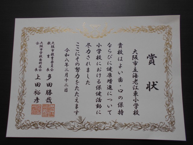 日頃から、海老江東小学校が、歯や口の健康を大切に考えてしているいろいろな活動が認められ、