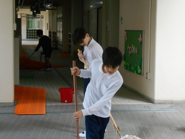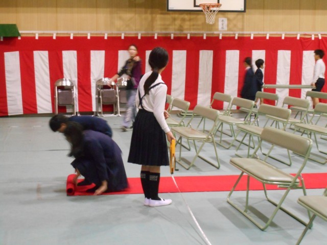 講堂での会場づくりや正門付近から講堂までの廊下のそうじ、