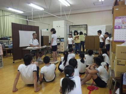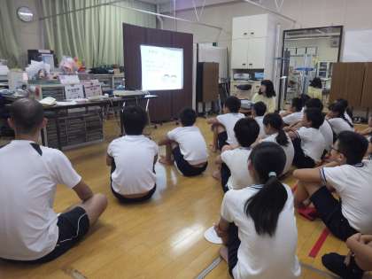 全学年、測定の前に、養護教諭が作成した「パワーポイント」を使って、