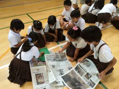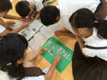 たてわり班で、決められた時間内に、新聞紙に印刷された文字を切り抜いて、