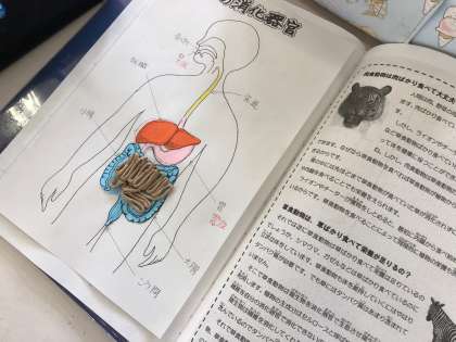 消化器官を描いた画用紙をプリントに貼りました。