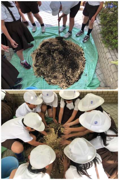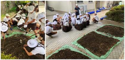 今日は黒土、赤玉土、鹿沼土をビニルシートに広げて、班のみんなで協力してよく混ぜました。