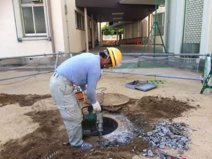 マンホールのふたが、土の表面に出ないように、作業をしてもらっています。