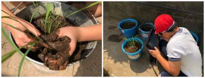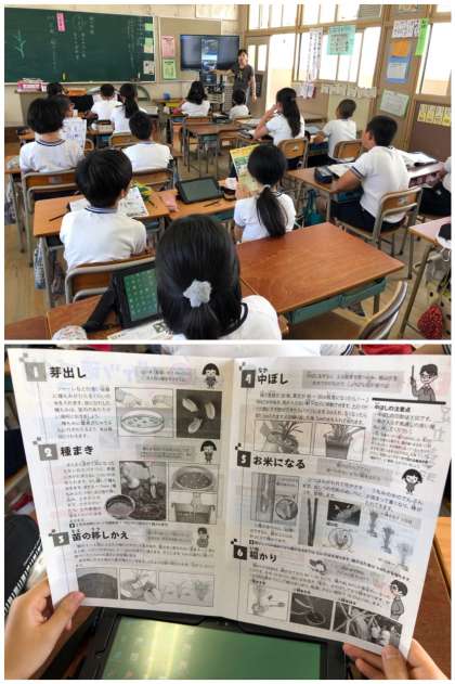 教室で、イネの苗の移し替えの説明をした後、バケツ稲の苗の状態をタブレットで撮影しました。