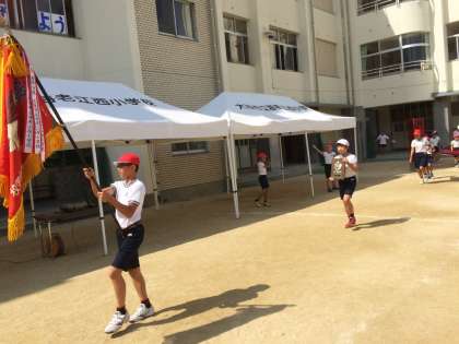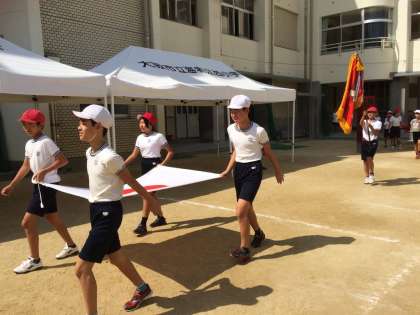 運動会の入場行進で、国旗、優勝旗、準優勝盾、校旗、園旗を持つ児童は、20分休憩の時間をつかって、練習をしています。