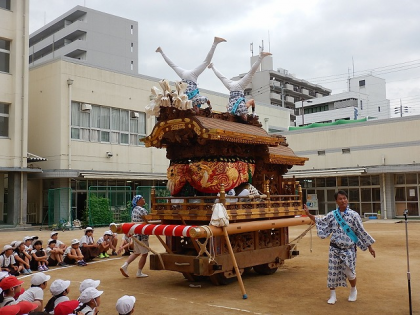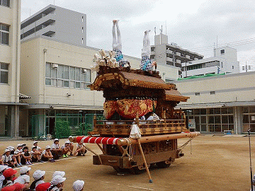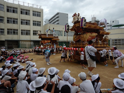 だんじりの姿に圧倒されましたね。お囃子の軽快なリズムが校内に響きました。