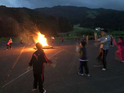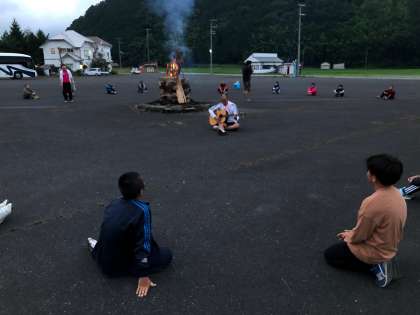 火を囲んで歌を歌ったり、ゲームをしたりして楽しい時間を過ごしています。