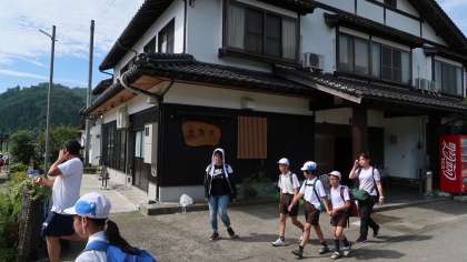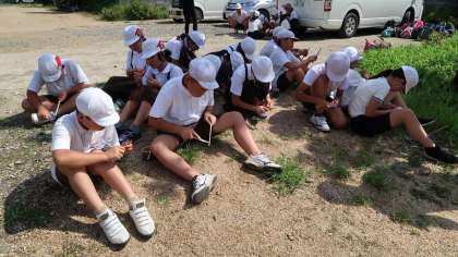高原亭本館で、小刀の扱い方と竹細工のやり方を教わり、ていねいに削っています。