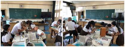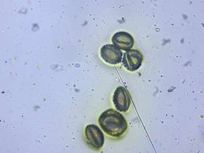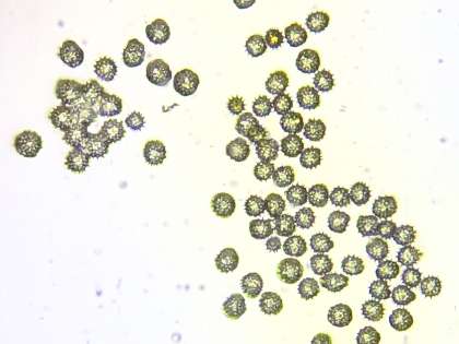 学校に咲いている花の花粉をセロハンテープに取り、それをスライドガラスに貼って顕微鏡で観察しました。