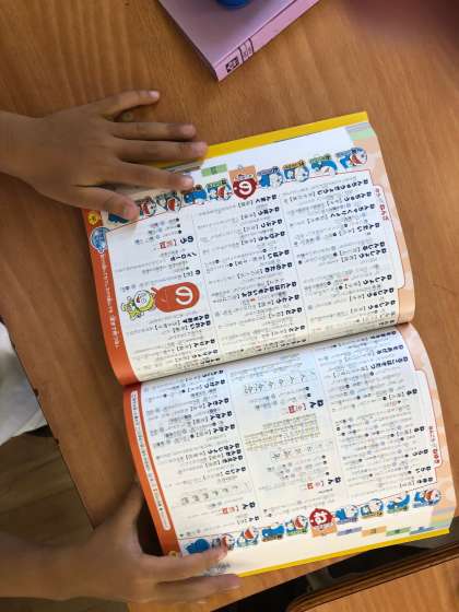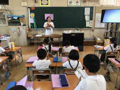 教科書に登場する国語辞典の使い方は3年生からですが、本校では国語科の研究の一環として、低学年から国語辞典に親しむことにより、豊かな言語力を育もうと活用をすすめています。今日は1年生が国語辞典にふれました。ドラえもんが各ページに取り入れられ、カラーの部分も多く楽しく国語辞典に親しむことができました。