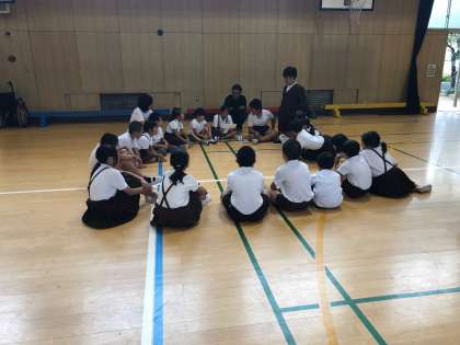 児童集会では、たてわり班に分かれて次の行事「海西フェスティバル」