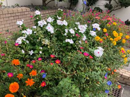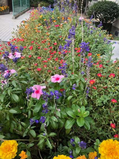 管理作業員さんが、お世話してくださっている玄関の植え込みが只今花ざかりです。