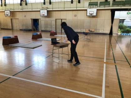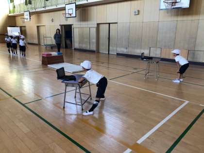タブレットを使って、自分がとび箱をとぶ姿を撮影します。