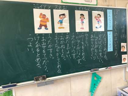 道徳の学習です。ドラえもんの登場人物の良いところ探しをしました。自分の良いところに気づいたり、互いの良さを認め合ったりすることの大切さを学び取ります。