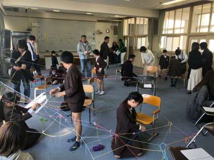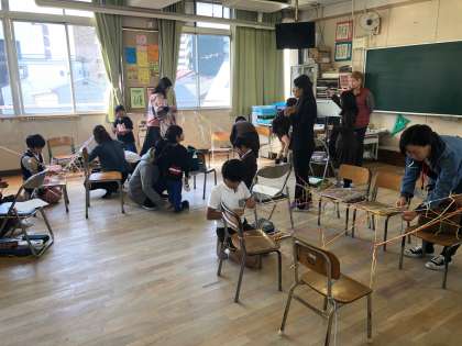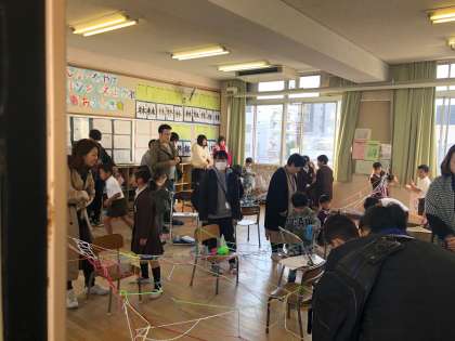 3,4年合同で図工の学習をしました。3年教室、4年教室、多目的室の3教室を使ってダイナミックな作品を作りました。色糸をつないだり、結んだりしながらいろいろな形を作ります。お家の方々にも参加していただき、素敵なアートができあがりました。