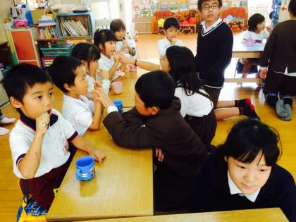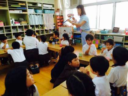 「歯みがき見守り隊」のお兄さん、お姉さん、また来てね。(さくら組の子ども達より)