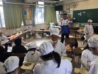 たてわり班で給食を食べます。1年も半分が過ぎ相互に顔見知りです。