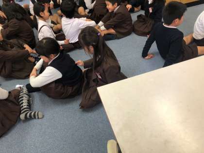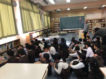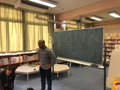 高学年がイングリッシュヴィレッジに出かけたので、C-NETのMrAさん、今日は1,2年生を対象に図書室で英語の授業をしました。形を表す英語の学習をしました。背中に指で形をなぞってもらって、その形の名前を英語で答えます。とっても盛り上がっていました。