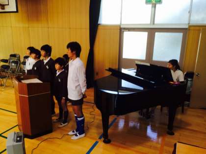 全校の代表で記念式典に参加する4・5・6年生が、式典で歌う曲を2曲、1・2・3年生に聞いてもらいました。