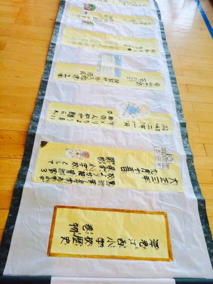 次に、新聞委員会の子ども達が、巻物で作った学校歴史新聞を発表しました。