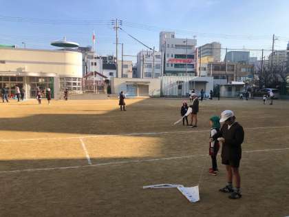1月7日に予定していた6年生のふれあい凧揚げ、天候不良により本日の実施となりました。園児の凧揚げを6年生がサポートします。園児も6年生も笑顔いっぱいの時間となりました。遊びを通して素敵なふれあいができました。