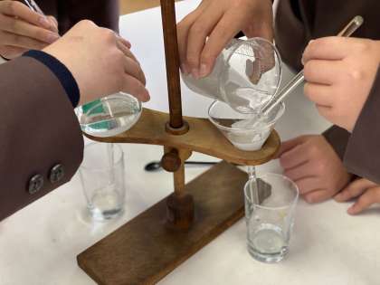前回の実験で60度にあたためて溶かした食塩とミョウバンの水溶液は、冷えたために溶けきれなくなった粒がビーカーの底にたまっていました。