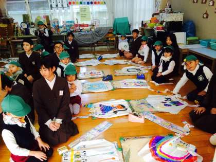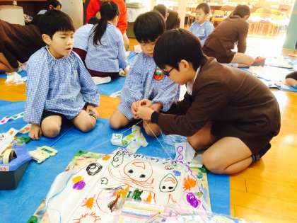 6年生と園児がペアになり、、園児が描いた凧に、ひごやたこ糸、あしをつけるのを6年生の子ども達が手伝ってくれました。