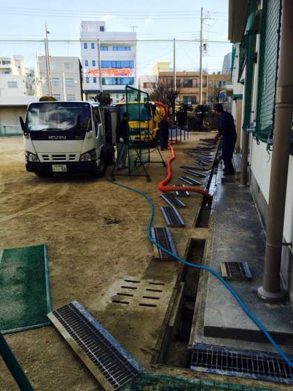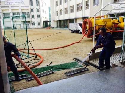 運動場や校舎周りの側溝や会所にたまった土や砂、泥などを、高圧洗浄機で吸い取る作業のことです。
