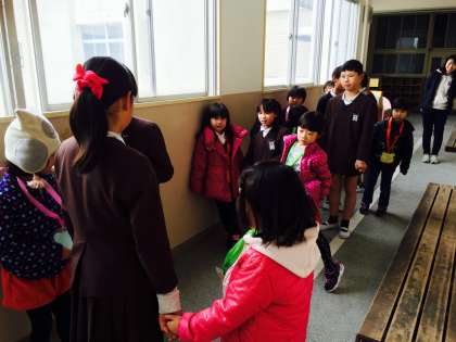 新1年保護者説明会の間、就学児は5年生に連れられて、学校めぐりをしました。