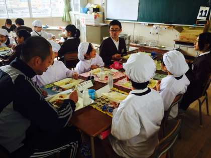 3回目の交流は、子ども達だけでなく、給食調理員さんや事務職員さんなど、教職員も一緒に楽しい会食をしました。